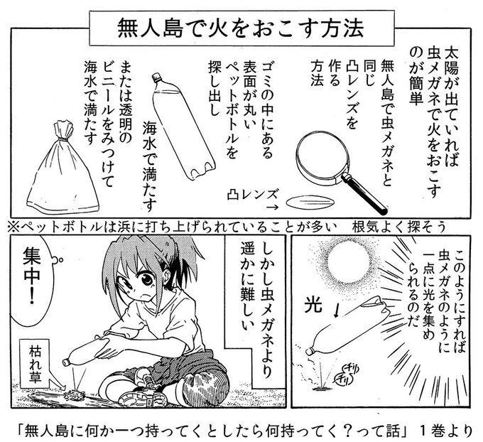 大塚志郎 びわっこ自転車旅行記 最新7巻発売中 無人島 で現代人が火を起こす方法です 遭難した際はぜひお試しください 本日最新話更新です 無人島に何か一つ持ってくとしたら何持ってく って話 第6話 体に力が入らない 大塚志郎 ニコニコ静画